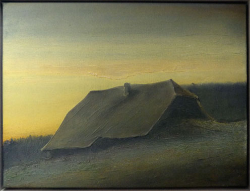 Nun zu diesen Bildern selbst. Es handelt sich also um Landschaftsmalerei, deren Bildgegenstand sich elementar darbietet als ein kleines Stück Erdoberfläche, Ort für eine architektonisch einzigartig prägnante stereometrische Form, das beim überkommenen Bauernhof alles zu seinem autonomen Leben Gehörige- Menschen, Vieh, Futter, Fuhrwerk, Geräte, Brennholz- wie eine brütende Henne unter sich bergende Walmdach. Die auf der Maltafel bis zum oberen Rand verbleibende Fläche hat die Funktion Himmel. Ein Himmel ohne die Raumestiefe, welche in der alten Landschaftsmalerei wesentlicher Teil der Bildsprache war; er wirkt hier wiederholt wie eine Hülle oder ein Vorhang. Die Bilder stellen in ihrer Mehrzahl Winterstimmungen dar. Die harten Grate der Walme sind verschneit und verschmelzen in weichen Übergängen im Bildgefüge. Licht- und Wetterstimmungen werden wesentliche Bildinhalte. Zu diesen Häusern führen keine Wege; von Bewohnern zeugt kein Indiz. (3)