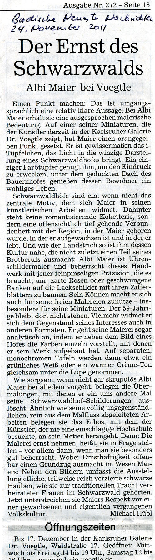Kritik Ausstellung Albi Maier Galerie Voegtle, Michael Hübl Badische Neueste Nachrichten 24.11.2011