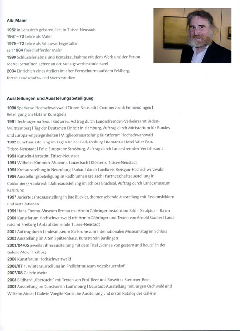 Albi Maier gibt im Gespräch von sich preis, er sei vor 60 Jahren ins Herzland des Schwarzwaldgebirges hineingeboren worden. Er habe anderswo zu sein nie ertragen und wisse bei Strafe leiblichen und seelischen Verkümmerns ebenda seinen einzig möglichen Lebensort. Er habe eine gründliche Ausbildung im Malerhandwerk absolviert und damit seinen Lebensunterhalt bestritten. Schon früh sei eine zeichnerische Begabung vorhanden gewesen, diese habe er aber nicht weiter gepflegt. Der Zufall habe ihm ein lädiertes Uhrenschild, also eines jener hölzernen, sorgfältig mit gemalten Blumenmotiven geschmückten Zifferblätter historischer Schwarzwalduhren in die Hand gegeben, die bei Sammlern sehr gesucht waren. Dieses habe er sorg fältig restauriert, daraufhin sich nachhaltig in derlei Handwerk eingearbeitet und mit Neuanfertigungen auf Bestellung einen einträglichen Erwerbszweig aufgetan. Bemerkenswert dabei, daß er unversehens der Letzte in einer über zweihundertjährigen Tradition bodenständiger Schwarzwälder Heimatkunsthandwerker geworden ist.