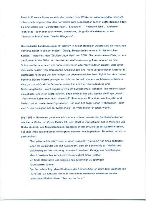 Einstige Bearbeitungsspuren, individuelle Färbung und damit eine leichte Zuordnung verschwindet unter einer hier weißen, in anderen Werkstücken dunklen oder rostfarbenen Fassung. Bei genauer Betrachtung wird auch bewußt, daß in diesen Fundstücken eine intensive Bearbeitung steckt. Was so spielerisch und leicht erscheint, ist Ergebnis eines langen Arbeitsprozesses. Chaos und Ordnung, Widerstreit, Dynamik, Zusammenspiel suchen ständig neuen Raum. Kräfte streben auseinander und wollen gebündelt sein. Jede Form strebt nach einer funktionierenden Verbindung: funktional wie formal. Jeder Eingriff, jedes neue Glied verändert das bis dahin stabile Gleichgewicht. Unterschiedliche Kräfte ziehen in die Horizontale oder Vertikale, verlangen Bodenhaftung oder wollen in luftige Höhe. Fast wie im Leben oder doch abstrakt? Pomona Zipser zeigt uns mit ihren filigranen wie robusten Skulpturen einen schmalen Grat zwischen Traum und Wirklichkeit, Phantasie und Gegenwart. Pralles Leben, Lust, Nachdenklichkeit, Trauer spiegeln sich in bildhaften Gesten, greifbar, lebendig, so vergänglich wie kostbare Momente als bildhafte Zeichen im Raum." ( Birgit Möckel, 2010, Berlin )