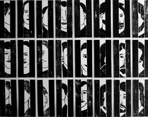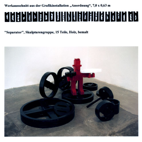 Im Mittelpunkt meiner Arbeit steht die Thematik des Menschen als Individuum in der Masse sowie der Aspekt der Vereinzelung, der Fragmentierung, des Entfremdens und des Auslöschens. Die Installation besteht aus zwei Arbeiten. Der "Separator", eine Skulpturengruppe aus Holz, bezieht sich auf die willkürliche vorgenommenen "Selektionen" bei der Ankunft in den Lagern. Das Fries von Holzdrucken steht für Menschen, die aus ihrem Alltagsleben herausgerissen und in die Lager verschleppt wurden. Als „Anordnung“ erinnern sie an die stattgefundene Erniedrigung, Deportation und anschliessende Ermordung.